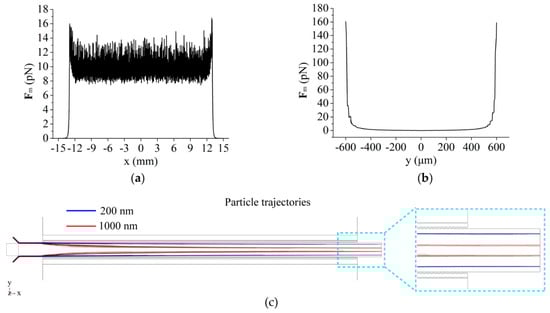 Calculated negative magnetophoretic force and particle trajectories based on the simulation results: (a) Negative magnetophoretic force acting on 1000 nm particles in the separation area along x-axis and (b) along y-axis; (c) The trajectories of 200 nm and 1000 nm particles in the simulation.