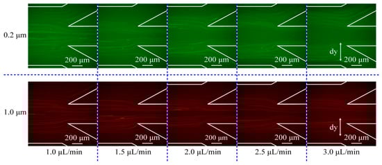 In the experiments, the optimal concentration of the ferrofluid was chosen as 0.003× (0.01%), based on our precious study [31]. Here, we first optimized the flow rate of the sample, the results of which are shown in Figure 4. Compared with the simulation results, the trajectories in the experiments are more divergent. For both the 200 nm and 1000 nm particles, the trajectories are moving to the side channel as the flow rate increases. In order to optimize the flow rates, we calculated the position distribution of particle trajectories along the y-axis direction, which is defined here as dy.