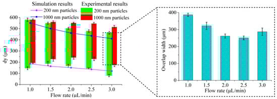 The comparison between simulation results and experimental results on the position distribution of particle trajectories at the outlet area under different flow rates of the sample flow are shown in Figure 5. Based on the position distribution, we calculated the widths of the overlap area of the two kinds of particles at different flow rates, and the overlap area demonstrates that the two kinds of particles are not separated effectively. The results show that the overlap width is the shortest at a flow rate of 2.5 μL/min, therefore we can conclude that the optimal sample flow rate is 2.5 μL/min (the ratio of the flow rates of the sample flow and the sheath flow is kept as 1:5, the ratio set can ensure that the particles are focused close to the channel wall without dispersing to outlet A when there are no magnets). Under the optimal conditions, most of the 200 nm particles flow into side outlets and finally converge on outlet B. On the contrary, most of the 1000 nm particles flow into outlet A through the center channel (Figure 4).