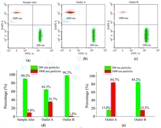 In order to quantitatively analyze the particles collected from the two outlets, we used a flow cytometer to count the particles, the results of which are shown in Figure 6. Here, we used FITC and DAPI as the fluorescent detection channels for the 200 nm and 1000 nm particles, respectively, and the standard particles of both sizes were gathered in a cluster. The 1000 nm particles were detected in the upper left corner (red cluster), while the 200 nm particles were gathered in the lower right corner (green cluster). The overall recovery rate of all particles is 99.0% (the ratio of the number of particles from outlets to that from the inlet). The purity of 200 nm particles reached 98.2% (the ratio of the number of 200 nm particles to all the particles from outlet B) and recovery rate was 84.2% (the ratio of the number of 200 nm particles from outlet B to that from all outlets), and the resolution reached 800 nm. Using the optimal parameters, the chip can effectively separate 200 nm particles from the mixed particles of two sizes. Both the theoretical and experimental results prove the high performance of the proposed system.