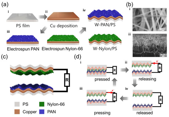 The schematic image of the final W-TENG structure, composed of W-PAN/PS and W-Nylon/PS, was represented in Figure 1c. According to this structure, nylon and PAN materials can vertically contact and separate to generate electrical energy. Here, an electric wire was connected to the deposited Cu to measure the electrical output produced by TENG.