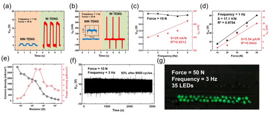 Electrical characteristics of the non-wrinkled TENG (NW-TENG) and wrinkled TENG: (a) VOC and (b) ISC. (c) Frequency-dependence of W-TENG. (d) Force-dependence of W-TENG. (e) Dependence of the load resistance on current density and output power of W-TENG. (f) Durability of W-TENG. (g) Serial connection of LEDs with W-TENG.