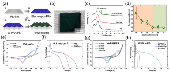(a) Fabrication of wrinkled PANI-coated PS/PAN (W-PAN/PS@PANI) substrate for supercapacitor. (b) Photograph of W-PAN/PS@PANI electrode. (c) X-ray diffraction (XRD) analysis (d) The sheet resistance of PANI with various coating time. (e) CV curve measured with scan rate of 100 mV/s. (f) GCD curve measured with current density of 0.1 mA/cm2. (g) CV curves measured at varied scan rates from 10 to 100 mV/s. (h) GCD curves measured at varied current densities from 0.1 to 1 mA/cm2.