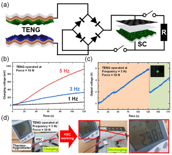 Figure 5a shows circuit diagram of energy conversion and energy storage system. For energy generation and the establishment of an integrated energy storage system, the previously produced W-TENG and HSC using W-PAN/PS@PANI electrode were combined using a rectifier. Here, alternating current (AC) power generated by W-TENG was successfully converted into DC through a rectifier. The converted electrical power from the W-TENG was charged to the fabricated HSC, utilized to turn on a small electronic device as well as a commercial green LED. The self-charging profiles of the integrated system under various input force was depicted in Figure 5b. In Figure 5b the effect of varying magnitude of applied frequency on the charging efficiency was shown. The rate of charging was gradually in the increase of input force. As a result, the 100, 350 and 930 mV were successfully charged with the input force ranging from 1 Hz to 5 Hz at 10 N. Finally, the device can be charged to about 0.9 V within only 115 s with the periodical contact–separation under 10 N of input force and 5 Hz of frequency. Based on the excellent charging efficiency of the proposed integrated system, a demonstration of a feasible application was demonstrated by lighting commercial LEDs. The stored electrical energy generated by the PS-TENG can bright a green LED (Figure 5c). As shown in Figure 5d, a commercial thermo-hygrometer was successfully operated by the fabricated HSC, which stores the electrical energy generated from the W-TENG. Herein, the electrical energy harvested by continuous contact/separation of W-TENG was utilized as the input source to power up a commercial small electronic device. With the charged electrical power in the HSC, the display of a thermo-hygrometer was illuminated. This feasibility of the power supply from our hybrid energy systems demonstrates the broaden applicability in the field of self-powered electronic devices. Based on the above micro-nano hybrid structure characteristics, a self-powered storage energy system capable of generating electricity with high efficiency from external mechanical movement and successfully charging was manufactured. The feasibility of self-actuation of integrated devices has been successfully demonstrated as practical applications for sustainable wearable electronics and small electronic devices.
