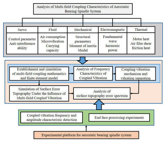 Figure 1. Based on the multi-field coupling characteristics of ABS, the multi-field coupling mathematical model and physical model of ABS are established, and the coupling model is simulated and analyzed. ABS model is used to study the influence of unstable factors such as mechanical, static pressure, servo, electrical, and thermal characteristics on the dynamic performance, including the different number of motor pole slots, motor rotor eccentricity, motor rotor imbalance, air supply pressure fluctuations, and other unstable factors. Through a combination of the theoretical analysis and experiment method, the vibration mechanism during the machining process is studied, and multiple fields are revealed in the generation mechanism of the vibration frequency domain under the coupling action, which separates the multi-field coupling vibrations, realizes the optimization under the multi-field coupling action of mechanical, electromagnetic, servo control, and static pressure, etc.