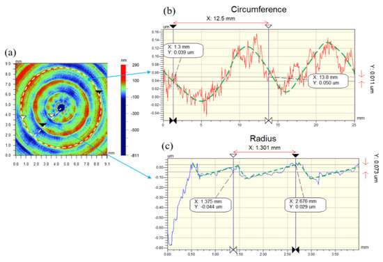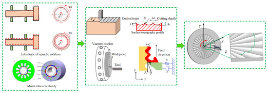 Figure 12b that a line segment is selected from the workpiece center to the edge, the selected line segment produces periodic ripples, and the ripple period distance is 1.3 mm. From the comparison of test results and theoretical analysis, it can be seen that complex vibration ripples are formed in the turning process due to the unstable rotation of ABS. This is caused by the unstable static pressure stiffness and the unbalanced rotation, which cause the turning instability.