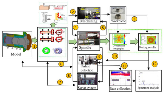 Figure 6, and the details are as follows: ① Dynamic simulation of ABS, ② cutting process and machining simulation, ③ processing workpiece shape prediction, ④ multi-physics detection, ⑤ autonomous adaptive components, ⑥ self-learning model and simulation of self-calibration detection technology, ⑦ servo control, ⑧ process control, ⑨ integrated control detection, ⑩ workpiece quality data feedback, and automatic adjustment of process settings, ⑪ signal collection library, ⑫ vibration signal multi-frequency spectrum separation calculation, ⑬ vibration frequency spectrum classification, stability. Based on the above analysis, the surface topography of ultra-precision machined workpiece can be predicted and studied. Usually, the surface waviness and texture of the workpiece surface topography are affected by low frequency, mainly due to the rotational vibration of the spindle, feed rate and the vibration of the cutting tool and so on. Meanwhile, based on kinematical-geometrical copying of the cutting tool onto the workpiece surface, the roughness of the workpiece surface are affected by the mechanical properties and thermic preparation, especially the tool position, the working condition of the machine, the cutting force, the tool wear, and the vibrations of the workpiece. Most of them depend on one or more factors predicting the surface roughness. Based on the above analysis, the workpiece surface topography model and qualitative simulation are summarized under the condition of spindle speed perturbation cutting, which is shown in