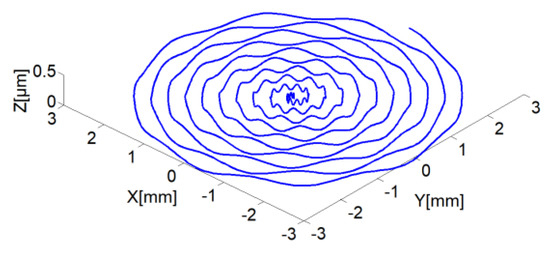 Due to the turning self-excited and external interference, the machining speed and the feed rate are periodically changed, and the machining force also changes periodically. Therefore, the relative displacement in the axial direction also changes periodically, and the machining force changes. The rigidity in the axial direction of the disc-shaped part is the weakest in the machining process, and the tool tip and the workpiece can be regarded as a spring damping system in the axial direction of the part. When the turning force of the spindle system changes periodically, the relative displacement outputs between the tool tip and the workpiece change periodically. Taking into account the relative displacement changes, the constant-speed cutting tool trajectory is modified, and periodic fluctuations in the axial direction are added on the basis of the plane spiral, which represents the relative displacement change between the tool tip and the workpiece surface in this direction, so the trajectory equation can be expressed as Equation (3).