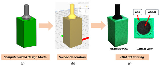 Fabrication process of 3D printed composite electrode. (a) Computer-aided design model, (b) G-code generation, (c) FDM 3D printing.