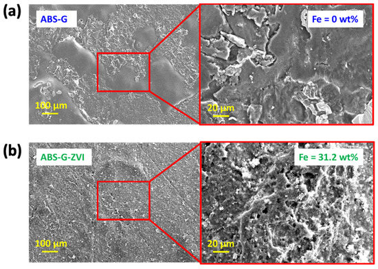 (a) Field-emission scanning electron microscope (FE-SEM) and EDX images of the 3D printed ABS-G electrode; (b) FE-SEM and EDX images of the 3D printed ABS-G electrode with electrochemically deposited ZVI.