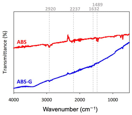 Figure 3 shows the FTIR spectra for the ABS and ABS-G electrode. The FTIR spectrum of ABS (see Figure 3) shows aliphatic stretching at 2920 cm−1, acrylonitrile at 2237 cm−1, C=C of butadiene at 1632 cm−1, and the styrene unit at 1489 cm−1 [12]. The graphene content in the ABS-G filament, reported to be 10% with respect to the functional groups of ABS-G, was the same compared to ABS, indicating that graphene did not change the chemical structure of ABS [32]. Absorption peaks at 1489 and 1632 cm−1 belong to the nitrile group and double bonds of butadiene and double bonds of styrene in ABS polymers [33]. The absorption peak at 2920 cm−1 refers to the aliphatic and aromatic C–H bonds in ABS [34].