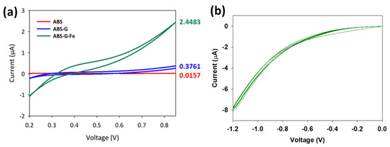 Figure 4a shows the CV curves of the 3D printed ABS, 3D printed ABS-G, and 3D printed ABS-G with electrodeposited ZVI electrodes measured in 0.05 M K3[Fe(CN)6 solution at a scan rate of 0.1 V/s tested within the potential range of 0.2 to 1.0 V (vs. Ag/AgCl). With just ABS, negligible electron-transfer capability was observed, indicating the inability of the ABS polymer to perform electrochemistry, whereas conductive ABS exhibited enhanced current detection. This was attributed to the graphene filler incorporation, which conferred the attractive properties of graphene, which has a single atomic layer of 2D carbon and exhibits excellent electron mobility, and graphite, with few or more layers of graphene. The electron mobility of graphene in ABS allows the material to be utilized as a transducer for sensor fabrication. Despite the ABS-G electrode depicting the capability of electron transfer, the conductivity was not feasible to be utilized directly in electrochemical sensing [35,36]. Thus, electrodeposition of ZVI onto 3D printed ABS-G was conducted to further enhance the redox capability of the 3D electrode, corresponding to 0.05 M ferricyanide as the electrolyte, as can be seen in Figure 4.