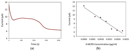 (a) Amperometric curves of ABS, ABS-G, and ABS-G with electrodeposited ZVI; (b) calibration plot of current measured versus 3-MCPD concentration (R2 = 0.9539).