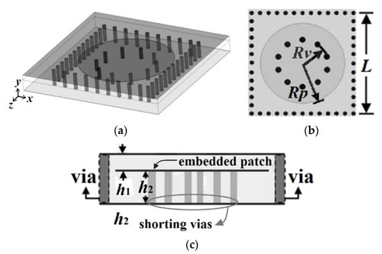 The proposed HMSICR is originated from the full-mode SICR given in Figure 1. This full-mode SICR is composed of three metal layers and two tightly stacked substrates with the same dielectric constant (εr) and loss tangent (tanδ). The thicknesses of the top and bottom substrates are denoted by h1 and h2, respectively. The cavity’s sidewalls are emulated by four periodically spaced thru-via arrays. The key point in miniaturizing the cavity is to reduce the cavity’s resonance frequency. This is accomplished by introducing a short-circuited circular metal patch in the cavity. The embedded circular patch is deployed in the middle layer (see Figure 1) and a circular array of blind vias is used to short the patch to the cavity’s bottom wall. The function of the embedded patch is to load the cavity with a large capacitance, which helps lower the resonance frequency [14,15]. It is expected that a cavity loaded with a larger capacitance will result in a lower resonance frequency. In Figure 2, we give the simulated normalized resonance frequency (fr/f0) and unloaded Q-factor (Qu) as functions of h1. In the simulation of this figure, the substrate is RT/duroid 5880 with εr = 2.2 and tanδ = 0.0009, which will also be adopted for our proposed HMSICR design. In addition, the metal sheets in the three metal layers all have the same thickness of 35 μm, the square cavity has a side length of L = 24 mm, the circular patch has a radius of Rp = 11 mm, the circular blind-via array has a radius of Rv = 5.5 mm, and the bottom substrate has a thickness of h2 = 1.58 mm. Here, fr is the resonance frequency of the full-mode SICR, and f0 = 5.97 GHz is the fundamental-mode (TE101-mode) resonance frequency of the conventional SIW cavity counterpart (i.e., the SIW cavity devoid of the circular patch and circular array of blind vias). It is observed from Figure 2 that a smaller value of h1 (corresponding to a larger loaded capacitance) leads to a lower resonance frequency. The fact that fr is much smaller than f0 indicates that the full-mode SICR structure can effectively miniaturize the SIW cavity resonator. Although the goal in lowering the resonance frequency is achieved in this structure, the drawback is that the full-mode SICR has a smaller Qu value than does its conventional SIW cavity counterpart having a Qu value of around 680. In Figure 3, we show the simulated curves of fr/f0 as functions of Rp and Rv. In the simulation, h1 is fixed at 0.254 mm, and other relevant structural parameters are the same as those used in the simulation of Figure 1. A larger value of Rp provides the cavity with a larger loaded capacitance and hence results in a lower resonance frequency. On the contrary, a larger value of Rv leads to a higher resonance frequency. This trend is opposite to that of the Rp variation and can be explained using a transmission-line model presented later for the HMSICR proposed in this section.