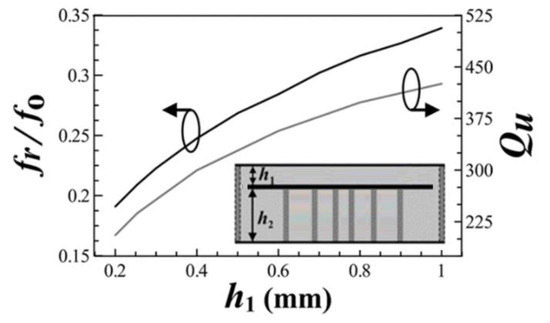 The simulated curves of normalized resonance frequency fr/f0 and Qu vs. the top substrate thickness h1 (with fixed h2 = 1.58 mm).