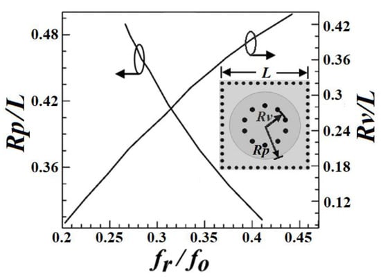 The simulated curves of the normalized resonance frequency fr/f0 vs. the dimension ratios of Rp/L and Rv/L (with fixed L = 24 mm).