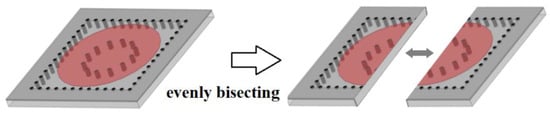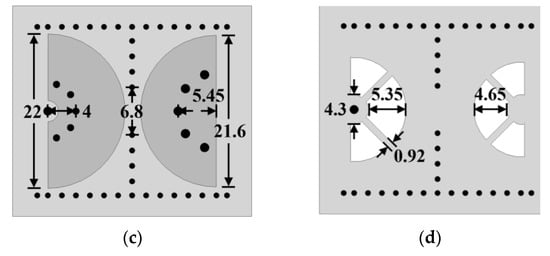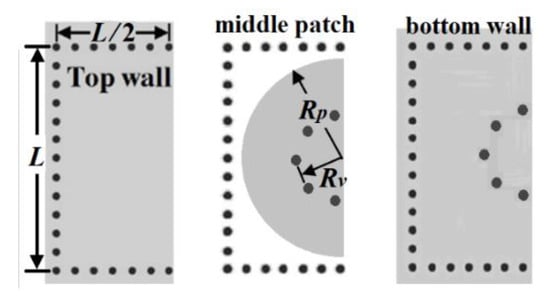 As shown in Figure 4, the proposed HMSICR is obtained by evenly bisecting the full-mode SICR given in Figure 1, and the layouts of the HMSICR’s three metal layers are given in Figure 5. The substrates adopted here are also RT/duroid 5880 and have the same thicknesses as those associated with Figure 3. Each of the blind vias has a diameter of 0.6 mm. The three thru-via arrays (also with a diameter of 0.6 mm for each via) mimic the three sidewalls of the cavity, and the fourth side of the cavity is open. The periodicity of the thru-via array is 2 mm. The open cavity in Figure 5 has the dimension of 12 × 24 mm2 (i.e., L = 24 mm in Figure 5).