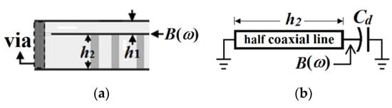 Here, Cd represents the loaded capacitance between the semicircular patch and the top and bottom walls, and it can be approximated by with denoting the permittivity of the substrates. Note that since h1 is much smaller than h2 in our design, h1 predominates over h2 in determining the loaded capacitance. In addition, is the phase constant with c0 standing for the speed of light in free space, and Y0 in (2) is the characteristic admittance of the short-circuited half coaxial-line model in Figure 6b. Upon enforcing B(ω) = 0 in (1) together with the approximation of cot(βh2)1/βh2, the HMSICR’s resonance frequency, fr, can be approximated by