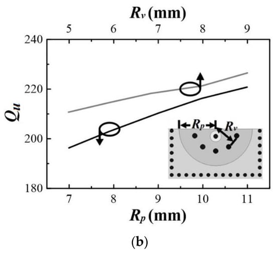 Simulated curves of (a) fr/f0 and (b) Qu vs. Rp (radius of the embedded patch) and Rv (radius of the semicircular via-ring).