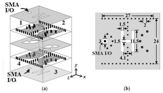 Two decades ago, a novel structure named the substrate integrated waveguide (SIW) [2,3,4,5] built by standard PCB technology was proposed. Although the SIW that emulates a metal waveguide is non-bulky and still possesses a reasonably high power-handling capability, the SIW resonator is still considered too large to be used for building compact microwave devices. To alleviate the large-size drawback of the SIW resonator, several pilot research works have been conducted to miniaturize SIW resonators [6,7,8,9,10]. In [6], the SIW is allowed to operate under the cut-off frequency with its broadside wall embedded with complementary split-ring resonators (CSRRs). In [7], the embedded CSRRs can reduce the fundamental-mode resonance frequency of an SIW cavity. As a result, the circuit size is reduced by the effect of frequency reduction. The size reduction can also be achieved by using the waveguide’s (or cavity’s) fractional-mode variants, e.g., the half-mode SIW [8] and quarter-mode SIW cavities [9,10]. Besides the size reduction, a wide bandwidth (BW) can also be observed in [10] owing to its triple-mode resonance. However, the radiation loss from the fractional-mode SIW’s open sides is larger at a higher operating frequency, and the circuit-size reduction is quite limited. Although the above-mentioned structures have achieved the size reduction to a certain degree, the circuit dimensions are still too large for commercial applications.