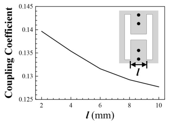 The coupling between the two side-by-side HMSICRs (i.e., between resonators 1 and 2, or between resonators 4 and 3) is dominated by the magnetic coupling which is controlled by the H-shaped slot etched on the cavities’ bottom wall. It should be noted that this magnetic coupling mainly depends on the induced currents flowing on the semicircular patch’s shorting vias, and the dimension of the open window (the window having a width of 6.8 mm indicated in Figure 8c) has a minor effect on the coupling strength. Therefore, we adopt an H-shaped slot to restrain the magnetic flux for controlling the coupling strength. Figure 9 shows the coupling coefficient between resonators 1 and 2 as a function of l (the width of the middle section of the H-shaped slot indicated in the inset). A larger coupling coefficient denotes a stronger coupling strength. In the coupling-coefficient calculation, the slot width and the height of the H-shaped slot are fixed at 1.5 and 11.5 mm, respectively. The coupling between the top and bottom HMSICRs depends on the fan-shaped apertures on the common broadside wall and the nearby semicircular patches. These apertures simultaneously introduce both electrical and magnetic couplings, whose corresponding coupling coefficients are negative and positive, respectively [17,18,19,20,21,22]. Note that the total coupling is the sum of the electrical and magnetic couplings, and the net coupling coefficient may be positive or negative. The employed HMSICRs possess two natural resonance frequencies, 1.85 and 1.92 GHz, respectively, for the left and right HMSICRs shown in Figure 8. The coupling coefficients (denoted by kij with the sub-indices i, j = 1, 2, 3, 4) are calculated to be k12 = k34 = 0.135, k24 = k13 = 0, k23 = 0.054, and k14 = –0.081, and the extracted external quality factor Qe is 14.3.