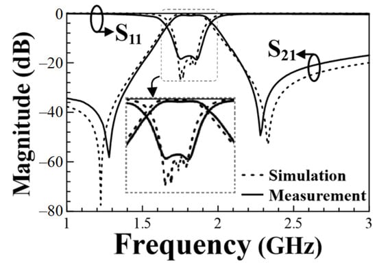 Figure 10 shows the measured and simulated frequency responses of the proposed BPF given in Figure 8. The zoom-in view around the passband region is also shown in this figure for clarity. Although compactly clustered, the four dips in the simulated S11 curve can still be distinguished. These four dips in the simulated S11 curve signify that the proposed BFP is a fourth-order design. However, from the measured S11 curve, we can hardly discriminate the four dips, and this might be due to the imprecise measurement resolution. This phenomenon can also be observed for the sample BPFs in [13]. The transmission zeros observed by the two passband edges are due to the well-known cross-coupling effect attributed to the circuit’s quadruplet topology [23,24,25,26]. The obtained measured (simulated) fractional BW (FBW) is 14.8% (14%) with the mid-band frequency of 1.81 (1.8) GHz. The measured (simulated) minimum in-band insertion loss (IL) is 0.6 (0.4) dB and the measured (simulated) TZs by the two passband edges are at the frequencies of 1.27 (1.22) and 2.28 (2.33) GHz.