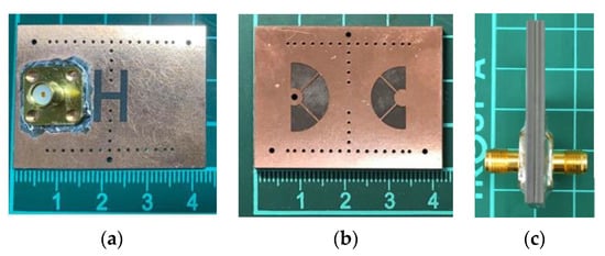 The circuit performance in terms of the mid-band frequency (fc), FBW, IL, upper stopband BW (USB BW), and especially the circuit size is summarized in Table 1 to compare with recent size-reduced SIW (or SIW cavity) BPFs. In the comparison table, our proposed fourth-order BPF occupies an area of only 0.24 λd × 0.22 λd with a maximum in-band IL of 0.6 dB and a FBW of 14.8%. Obviously, our BPF has a better size efficiency than other circuits in the table. Note that the fourth-order BPF in Figure 6 of [13] in Table 1 has a circuit size of only 0.26 λd × 0.26 λd, and the corresponding size efficiency is closest to ours. In that BPF, the patch is shorted to the bottom wall using only one blind via instead of a circular array of blind vias. Although this strategy is recognized to very efficiently lower the resonance frequency of an SIW cavity, the BPF in Figure 6 of [13] suffers a relatively high IL. This is because the conduction loss associated with the patch’s current flowing to the bottom wall through only a single blind via is larger than that through an array of blind vias. Photos of the experimental circuit in this paper are given in Figure 11.
