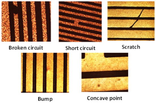 In FICS defect detection, under the industrial standard, at present, the defect detection accuracy in the gold finger area of FICS is less than 2 um; for line width, line spacing and aperture, the detection accuracy is more than 2 um. Defects such as short circuit, open circuit, gap, scratch, bulge and depression are easy to occur in the production process, as shown in Figure 4. Furthermore, the generated defects affect the electrical performance of the high density FICS. In the detection process, the image segmentation technology has an important position in accurately extracting the line width and line distance of the FICS image. The line refers to the wire used to conduct current on the FICS. For wire gaps and gap-type defects, they mainly refer to open-circuit defects and short-circuit defects between line wires. Short-circuit and open-circuit defects are generally caused by the attachment of the circuit part to the flexible substrate, so that the metal wire cannot be completely separated from the carrier film.