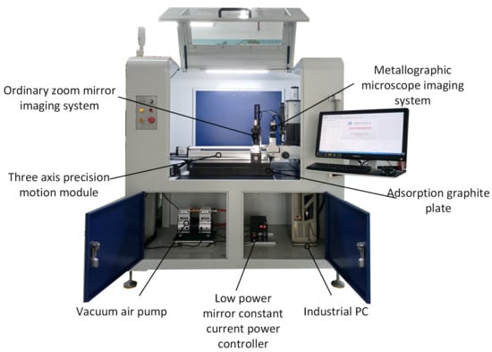Figure 7 shows the physical image of the intelligent detector for the appearance defect of the flexible IC package substrate. The hardware core is composed of X, Y, Z three-axis motion module frame equipped with high and low imaging systems. The three-axis motion module is mainly responsible for the movement of the imaging system on the working platform. The imaging system is mainly responsible for the image acquisition of the area to be inspected. A sophisticated motion platform is the key to accurate imaging of the imaging system. The vision imaging system is mainly composed of industrial cameras, industrial lenses and machine vision light sources. When the area to be inspected is too large and exceeds the single field of view of the camera, it is necessary to control the precision motion platform equipped with the camera by the industrial computer for image acquisition. This article uses a three-axis motion module to achieve large-scale image acquisition. The platform includes key accessories such as motors and drivers, ball screws, stages, limit sensors and drive boards.