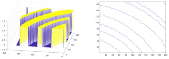 Firstly, the experiment is carried out on the conductor at the turn of the normal line. Set initialization parameters: space step is 1, time step is 0.1, Gaussian kernel variance , , , , . Initialize the level set function and auxiliary function to make ; the number of iterations is 40, and the evolution is stopped. As shown in Figure 10, Figure 10a is the original image, Figure 10b is the image classified by the K-means algorithm, Figure 10c is the image after median filtering, Figure 10d is the image after the morphological filling hole algorithm, Figure 10e is the image after the closing operation and Figure 10f is the image obtained after the feature extraction of the model in this paper. The level set function after evolution is shown in the left picture of Figure 11 and the pixel coordinates extracted from the edge of the line are shown in the right picture of Figure 11.