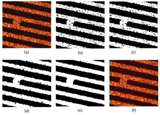 Display diagram of the algorithm for short-circuit defect feature extraction. (a) is the original image; (b) is the image classified by the K-means algorithm; (c) is the image after median filtering; (d) is the image after the morphological filling hole algorithm; (e) is the image after the closing operation and (f) is the image obtained after the feature extraction of the model in this paper.