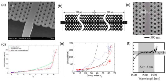 Slow-light waveguides have larger loss than do conventional waveguides, and as the group index of refraction increases, the loss will also increase. For the slow-light effect to be applied in a practical condition, the large loss is a limiting factor that needs to be optimized. In 2010, L. O’Faolain et al. proposed a theoretical model for the loss of photonic crystal waveguides. The SEM micrograph of the photonic crystal waveguide is shown in Figure 2a. In this model, the entire hole will contribute to the scattering coherently. Based on the theory, they designed and fabricated low-loss photonic crystal waveguides (Figure 2d). The model can further reduce the loss of slow optical waveguides under existing process conditions. Meanwhile, they illustrated the importance of the loss per unit time metric for measuring the quality of slow-light waveguides. [35]. In 2012, J. Li et al. proposed a method by introducing a mode conversion interface of “slow–fast–slow” to reduce the scattering loss in lithographic stitching errors for photonic crystal waveguides with slow-light effect, as shown in Figure 2b. Based on this mode conversion, they reduced the waveguide loss from 320 dB/cm to 130 dB/cm at the group index of 60 (Figure 2e). Simultaneously, the length of the waveguide they fabricated by electron beam lithography reached 800 mm, which is much longer than the limited writing field of the electron beam lithography tool, thus the manufacturing difficulty of high-performance photonic crystal waveguides can be reduced [36].