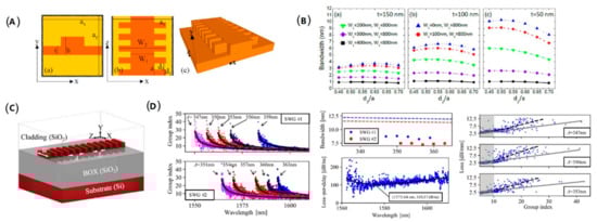 The silicon grating waveguides, as another periodic waveguide structure with slow-light effect, possess a simpler configuration than that of photonic crystal waveguides. In 2018, M. Passoni et al. developed a systematic analysis to investigate the photonic bands and group index in silicon grating waveguides. The scheme of the grating waveguide structure is illustrated in Figure 3A. They combined numerical methods and perturbation theory to demonstrate the slow-light performances with the change of geometric parameters. When the internal waveguide width and cladding silicon thickness are reduced, the slow-light bandwidth increases obviously. For instance, when the internal waveguide width gets to zero, the slow-light bandwidth reaches maximum. When the cladding silicon thickness reduces from 150 to 50 nm, the bandwidth increases from 3 nm to 10 nm (Figure 3B) [38]. In 2020, P. Jean et al. studied the slow-light effect in subwavelength grating waveguides experimentally on the silicon-on-insulator (SOI) platform, as shown in Figure 3C. By analytical modeling and 3D FDTD, they conducted detailed numerical study. The grating waveguides were fabricated by electron beam lithography process, and the resulting metrics included the large group index of 47.74, large slow-light bandwidth of 8.82 nm, loss-per-delay figure of merit of 103.37 dB/ns, and low loss of 12.5 dB/mm for the maximum group index (Figure 3D). Meanwhile, they demonstrated that controlling the design parameters will change the operation region of slow light over a large wavelength range. Based on the SOI platform, the subwavelength grating waveguides with slow-light effect have the advantage of compactness and are easier to manufacture, which makes them suitable for application in integrated optoelectronic devices [39].
