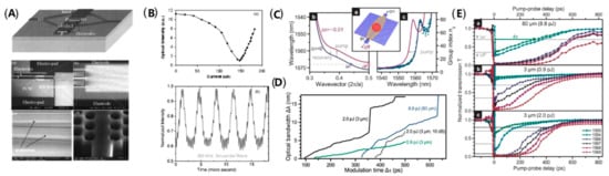 In 2005, Y. Jiang et al. demonstrated an ultra-compact silicon (EO) Mach–Zehnder modulator based on silicon photonic crystal waveguide for the first time, as shown in Figure 4A. The modulator has a footprint of 80 μm, and the phase shift driving current across the active region is only 0.15 mA. The 92% modulation depth is achieved at 0.15 mA, and the modulation curve for 300 kHz sinusoidal wave with a peak current of 0.11 mA is also illustrated (Figure 4B). As the first experimental demonstration, this study demonstrated the feasibility of combining photonic crystals with silicon modulator waveguides [42]. In 2013, A. Opheij et al. designed and fabricated a silicon dispersion engineered photonic crystal modulator that is only 3 μm long, based on the slow-light effect brought by photonic crystal waveguide. Figure 4C illustrates the schematic of the device with the band structure and group index of the waveguide mode. With an optical bandwidth of 7 nm, the modulation times of the modulator range between 500 ps and 100 ps. The relationship between optical bandwidth and the modulation time is shown in Figure 4D, which shows the trade-off between the two parameters. The dynamics of the modulator are demonstrated in Figure 4E, the transmission through the waveguide will change with time delay for several different wavelengths [43]. As early experimental explorations of silicon photonic crystal modulators, these researches showed the impressive advantage of silicon photonic crystal modulators especially in ultra-compact footprint and low energy consumption. However, the absolute performance of the modulators is not strong enough to satisfy the practical working requirements.