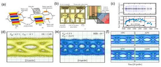 Taking the advantage of the compact footprint of silicon photonic crystal modulators, researchers have done a lot of work to further improve their high-speed performance under CMOS process. In 2012, H. Nguyen et al. demonstrated the silicon photonic crystal modulators with sub-100 μm length. The schemes of the two modulators with dual and single phase-shifter are shown in Figure 5a. Especially, the optical image of the 50 μm dual phase-shifter device is illustrated in Figure 5b. Based on the dual phase-shifter device with a length of only 50 μm, they obtained 10 Gb/s eye diagram of the on–off keying (OOK) over a bandwidth of 12.5 nm (Figure 5d). Meanwhile, based on the single phase-shifter device with a length of 90 μm, they achieved 40 Gb/s eye diagram (Figure 5e). The experimental results showed that silicon photonic crystal modulators can reduce the footprint by an order of magnitude compared with conventional silicon MZMs and also achieve high-speed transmission. However, the RF electrodes of the modulators were not optimized, and there is space for improvement [44]. Furthermore, they designed a 90 μm dual phase-shifter photonic crystal modulator with a spectral operating bandwidth of 16.9 nm, shown in in Figure 5c. Due to the large operating wavelength range, the modulator exhibits a good temperature stability. When the temperature changes from 19 to 124 °C, the 10 Gb/s eye diagram amplitude of the modulator is consistent within ±25%, shown in Figure 5f. This demonstrates the advantage of silicon photonic crystal modulator over silicon MRMs in terms of temperature stability, and better temperature stability of the slow-light device is the basis for the practical application [45].