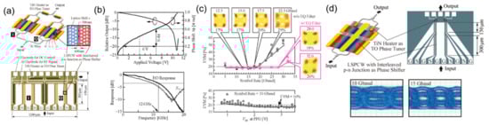 - Wang, C.; Zhang, M.; Chen, X.; Bertrand, M.; Shams-Ansari, A.; Chandrasekhar, S.; Winzer, P.; Loncar, M. Integrated lithium niobate electro-optic modulators operating at CMOS-compatible voltages. Nature 2018, 562, 101–104. [Google Scholar] [CrossRef]