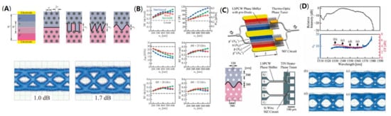 The polymer, characterized with the advantages of large EO coefficient, ultrafast response time, low dispersion, and spin-coating feature, is regarded as an ideal material for the EO modulators with low power consumption, ultra-high-speed operation, and ease of fabrication [53]. Hybrid integration of the silicon-based photonic crystal waveguides with electro-optic polymer realizes high-performance ultra-compact optical modulators through the combination of the slow-light effect and the unprecedented EO properties of polymers. In 2008, the electro-optic modulator with a polymer-infiltrated silicon photonic crystal waveguide was firstly proposed, which achieves a bandwidth of 78 GHz, a drive voltage amplitude of 1 V, and a length of only 80 μm [54]. Several physical effects were exploited for the remarkable performance, including the fast and strong nonlinearities of polymers infiltrated into silicon, the long interaction time provided by the Mach–Zehnder interferometer with slotted slow-light waveguides, and the short modulator length boosting the RC-constant-limited bandwidth [54]. Subsequently, such an EO modulator was demonstrated experimentally. By hybrid integration of the EO polymer with photonic crystal waveguide, an ultra-efficient EO modulation with a record low modulation efficiency of 0.56 V·mm was demonstrated. The modulated signal shows strong wavelength dependence and peak enhancement of 23 dB (Figure 10A) [55]. Nevertheless, the in-slot EO efficiency is relatively low due to the degrading poling efficiency, hindered by the narrow slot. A 320 nm slot for an electro-optic polymer-infiltrated silicon photonic crystal waveguide is demonstrated to overcome the problem. An effective in-device r33 of 735 pm/V as well as VπL = 0.44 V·mm were achieved (Figure 10B) [56]. A narrow operating optical bandwidth of <1 nm is an important problem remaining among slot photonic crystal modulators because of the high group-velocity dispersion in the slow-light optical spectrum range. To broaden the operating optical bandwidth of photonic crystal modulators, X. Zhang et al. demonstrated the lattice-shifted photonic crystal waveguides. The spatial shift of certain holes provides low-dispersion slow light and realizes an optical operation range of 8 nm (Figure 10C) [57]. A modulation efficiency of Vπ L = 0.282 V·mm measured at 100 KHz is achieved by slow-light enhancement, which realizes a record high effective in-device EO coefficient (r33) of 1230 pm/V. In addition, by introducing the silicon doping and backside gate technique, the EO bandwidth of the device is measured to be 15 GHz (Figure 10D) [58].