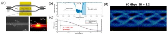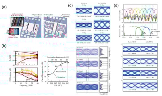 As can be seen, when the structure of photonic crystal is introduced to the modulator, the slow-light effect will increase the modulation efficiency, and hold a wide working spectrum in the meantime. However, the phase mismatch between slow light and RF signals limits the high-frequency performance of the modulator. To overcome this issue, in 2019, Y. Hinakura et al. designed the meander line electrodes that can delay RF signals to reduce the electrooptic phase mismatch between slow light and RF signals. The structure comparison between the normal electrodes and the meander line electrodes is demonstrated in Figure 8a. Through this approach, the EO bandwidth reaches 31 GHz and 38 GHz experimentally according to the termination resistors adopted (Figure 8b) [49]. Furthermore, using the meander line electrodes, they demonstrated a silicon photonic crystal modulator, which has the modulation efficiency of 0.44 V·cm, a working spectrum over 15 nm, and a length of 200 μm. Especially, based on the excellent high-frequency performance and modulation efficiency of the device, the improvement in signal transmission is impressive. A 64 Gb/s OOK signal and a 100 Gb/s PAM-4 are realized (Figure 8c), while a 4 × 50 Gb/s wavelength division multiplexing using an additional MUX chip is demonstrated (Figure 8d) [50]. Overall, the silicon photonic crystal modulator has the advantages of compact footprint, low cost, high speed, and wide working spectrum, demonstrating an important application prospect in the next-generation network.