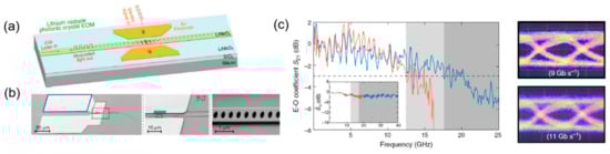 - Li, M.X.; Ling, J.W.; He, Y.; Javid, U.A.; Xue, S.X.; Lin, Q. Lithium niobate photonic-crystal electro-optic modulator. Nat. Commun. 2020, 11, 4123. [Google Scholar] [CrossRef]
