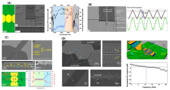 Silicon-based polymer photonic crystal modulator. (A) Optical and SEM images of the polymer-infiltrated silicon photonic crystal slot modulator and its wavelength dependence of normalized modulated signal (blue line) and normalized optical transmission (black line) [55]. (B) SEM picture of the 320 nm-wide silicon photonic crystal slot waveguide. The modulation measurements showing a low Vπ of 1.3 V [56]. (C) SEM images of the band-engineered, EO polymer-refilled silicon slot photonics crystal modulator. Measured Vπ and corresponding calculated effective r33 versus wavelength (at 100 kHz) [57]. (D) SEM images of the polymer-refilled photonic crystal modulator with RC time constant engineered and a backside gate technique. Measured normalized EO response of the modulator as a function of RF frequency indicates a 3 dB modulation bandwidth of 11 GHz [58].