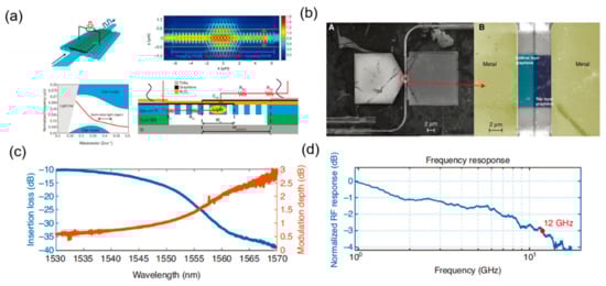 Integrating 2D materials such as graphene to silicon devices has proved to be an effective way to improve the performance of the silicon-based EO modulator, including modulation speed and efficiency [18,59]. The EO modulation realized by electron accumulation makes the graphene EO modulator a promising candidate for low-temperature-environment application and long-haul communication [60,61]. The graphene is also integrated with photonic crystal waveguide to increase the light–matter interaction. In a recent work, a double-layer graphene electro-absorption modulator was demonstrated in telecommunication applications, as shown in Figure 11a,b, which achieves a modulation of 1.5 dB at 1555 nm (Figure 11c) and a modulation bandwidth at 12 GHz (Figure 11d) [62].