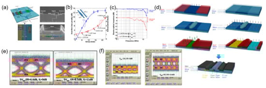 In 2011, A. Brimont et al. demonstrated a silicon slow-light modulator with Mach–Zehnder interferometer to explore the effects of introducing grating structures into silicon modulator waveguides (Figure 12a). The slow-light effect changes the group index, and they illustrated that the modulation efficiency changes with the group index experimentally. In fact, the modulation efficiency of the modulator is enhanced by the increase of the group index. When the group index increases up to 22, the modulation efficiency achieves a value of 0.45 V·cm, as shown in Figure 12b. Meanwhile, the EO bandwidth of two modulators with slow-light phase-shifter lengths of 0.5 mm and 1 mm can reach 16 GHz and 11 GHz, respectively (Figure 12c) [64]. For slow-light phase-shifters of 500 μm, the modulator achieves an eye diagram of 40 Gb/s with 6.6 dB extinction ratio at quadrature (Figure 12e), with an enhanced modulation efficiency of 0.85 V·cm and on-chip insertion loss of 6 dB [65]. For 1 mm slow-light phase-shifters, the high modulation efficiency of 0.6 V·cm allows the modulator to work from 5 Gb/s with 1 Vpp up to 25 Gb/s with 3 Vpp, shown in Figure 12f. The low drive voltages make the device more suitable for the application of CMOS transceivers, but the insertion loss is relatively high, reaching 12 dB [66]. It can be seen that the modulation efficiency has been significantly improved, thus the footprint can be reduced to the order of several hundred microns, and achieve a favorable eye diagram at high speed, while containing the length of 1 mm is beneficial for achieving a low drive voltage. It is worth noting that the waveguide grating modulator is very suitable for manufacturing under CMOS fabrication process, and the specific procedures are illustrated in Figure 12d [66]. As early explorations into the introduction of waveguide grating structure in silicon modulators, these results demonstrate experimentally that the slow-light effect brought by waveguide grating can enhance the performance of silicon modulators under CMOS fabrication process.