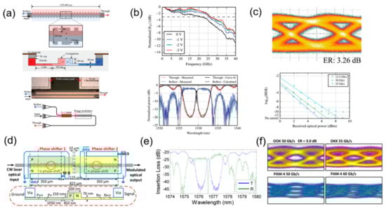 In 2015, M. Caverley et al. reported a silicon modulator with quarter-wave phase-shifted Bragg grating resonator on the SOI platform. With a length of 155 μm, the modulator has two ports, through port and reflect port, shown in Figure 13a. The modulated output signal is mainly obtained from the reflect port, which has a spectral response of a sharp notch, and the modulator demonstrates the EO bandwidth of 26 GHz (Figure 13b), and achieves the OOK eye diagram of 32 Gb/s with a bit error ratio (BER) of less than 10−10 of 25 Gb/s, as shown in Figure 13c. However, the spectrum of the modulator is very narrow, and its operation is affected by the wavelength, which affects its practical application [67]. In 2016, K. Bédard et al. demonstrated a dual phase-shift silicon modulator with Bragg grating structure, as shown in Figure 13d. The silicon waveguide grating modulator achieves an OOK signal up to 55 Gb/s with MMSE equalization and up to 50 Gb/s without equalization, while PAM-4 signal is illustrated at 60 Gb/s (Figure 13f). However, although the modulation speed is high, this modulator has a long length of 825 μm with a narrow spectrum (Figure 13e), which is insufficient to illustrate advantages compared to conventional silicon MZMs and MRMs [68].