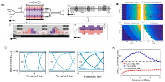 Due to the introduction of the grating structure into the modulator waveguide, the parameters and period of the grating will have a significant impact on the performance of the modulator. Through establishing a quantitative model, the different parameters of the grating will be related to the performance of the modulator directly. Therefore, establishing a precise simulation model of a silicon slow-light modulator assisted with waveguide grating will guide the specific design. In 2019, O. Jafari et al. demonstrated the design of silicon integrated Bragg grating resonators modulator. In each arm of the Mach–Zehnder interferometer, a series of Bragg gratings resonators are introduced to enhance the phase modulation ability based on slow-light effect, as shown in Figure 14A. Therefore, the designed silicon Bragg gratings modulator has stronger phase modulation capability than that of conventional silicon MZMs, while holding a large optical bandwidth compared to silicon MRMs. They established a complete theoretical model to explore the effect of different Bragg parameters, including NOP and NOR (NOP: number of periods of the resonator mirrors on each side; NOR: number of resonators), on the device performance. Therefore, the modulator was optimized according to the modulation efficiency, efficiency factor, enhancement factor, and optical bandwidth (Figure 14B). Through the simulation modeling, the variation law of the performance of the device with the structural parameters was more completely and intuitively reflected, which has reference significance for the practical design of the device. In particular, according to the dynamic response model of the modulator based on the coupled-mode theory, the large-signal analysis was performed using the finite-difference time domain and the OOK eye diagram up to 110 Gb/s, simulated in Figure 14C, showing the ultra-high-speed operation potential of the modulator [70]. Furthermore, focus on the efficiency–speed tradeoff in silicon slow-light modulators, they established a comprehensive model for the EO response of lumped-electrode slow-light modulators. Meanwhile, for the silicon slow-light modulators with traveling-wave electrodes, they used the finite-difference time-domain method to show that the efficiency and speed can both be improved under an optimized slow-light effect. The relationship between the EO bandwidth and enhancement factor is demonstrated in Figure 14D. However, the additional loss caused by slow-light waveguide limits the application of such modulators [71].