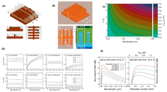 Meanwhile, optimizing the PN junctions is also the method to improve the modulation efficiency for the silicon modulator. The modulation efficiency can be improved by introducing interleaved PN junction, and combining these two structures to further optimize silicon modulators has also become an attractive research point. In 2019, M. Passoni analyzed this composite structure theoretically. Based on the silicon slow-light modulator with the waveguide grating structure in Figure 15A, the interleaved PN junctions with the same period as the grating were introduced into the modulation arm, to achieve optimal matching between the electromagnetic field and the depletion regions of the PN junction, thereby further improving the performance of the modulator. The bandwidth of the modulator was increased by the interleaved PN junction, because the spatial matching between the field of the grating and the depletion region is independent for wavelength. According to the simulation results, the modulation efficiency was improved compared to the conventional silicon modulator, with 0.1–0.5 V·cm over a bandwidth of 20–30 nm, as shown in Figure 15C. The research illustrates the trade-off between modulation rate, loss, and energy consumption. However, the optimization of the device was not enough, and further optimization should be able to get better results [72]. Furthermore, they developed the full simulation of the silicon slow-light modulator with interleaved PN junction along the waveguide axis, as in Figure 15B. The simulation investigated the optical modulation amplitude (OMA), which accounts for loss and modulation efficiency, further elaborating the trade-off among modulation efficiency, cutoff frequency, optical modulation amplitude, insertion loss, and dissipated energy per bit. Figure 15D demonstrates the comparison of modulation efficiency, IL (Lπ), for phase-shifters in four different conditions. After introducing the structure of the interleaved PN junction, the optical bandwidth is wider than the slow-light bandwidth. Under the condition of 1 V reverse bias, the modulator can achieve an energy below 0.5 pJ/bit and a bandwidth of tens of nanometers with a length below 0.5 mm (Figure 15E). This simulation demonstrates that a suitable design of interleaved PN junction will enhance the performance of silicon slow-light modulator for reducing power dissipation [73].