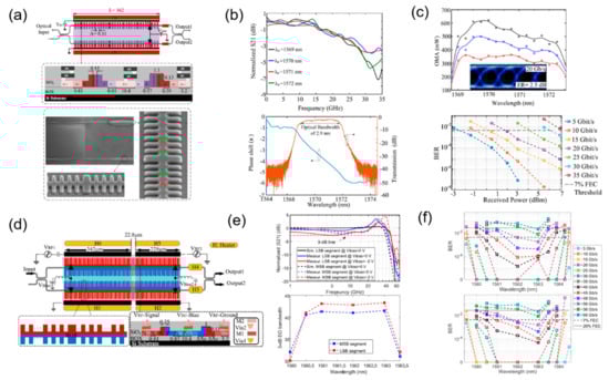 On the basis of the previous exploration of simulation research, the practical experimental performance research of silicon waveguide grating modulators has also made progress in recent years. In 2020, O. Jafari et al. demonstrated a silicon slow-light modulator assisted by phase-shifted Bragg gratings experimentally, which was fabricated under CMOS process, shown in Figure 16a. The integrated Bragg grating resonators enhanced the phase modulation efficiency significantly, and a small-signal Vπ × L of 0.18 V·cm was obtained, which is an extremely high value for an all-silicon modulator. These experimental data prove the significant effect of the slow-light structure on improving the modulation efficiency of the modulator. Meanwhile, the modulator shows an EO bandwidth of 28 GHz and an optical bandwidth of 2.9 nm (Figure 16b), with a length of 162 μm, which is much smaller than that of conventional silicon MZMs. The optical bandwidth is larger than that of the silicon modulators with waveguide grating reported before, which should provide an operating temperature range larger than 40 °C and illustrate the advantage compared to silicon MRMs. Meanwhile, OOK modulation is demonstrated at 30 Gb/s with a BER below the 7%-overhead FEC threshold in Figure 16c. However, in general, although the modulation efficiency and footprint of the modulator have both achieved ideal values, the EO bandwidth of the modulator is still not large enough and the high-speed performance is limited, while the optical bandwidth also has a certain space for optimization for a more stable working condition [74].