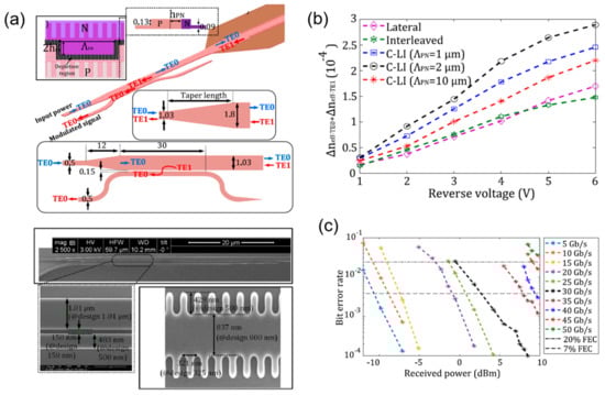 Meanwhile, in 2021, O. Jafari et al. designed a silicon mode-conversion modulator, combing the structure of asymmetric Bragg grating with lateral and interleaved PN junctions (C-LI) to enhance the phase modulation ability, as shown in Figure 17a. Under the mode conversion brought by an asymmetric Bragg grating, the modulator can work in reflection mode. Meanwhile, after employing the lateral and interleaved PN junction, the modulator gains a 67% improvement in the phase modulation, as shown in Figure 17b. The modulator achieved 45 Gb/s with a BER below the 7% forward-error-correction (FEC) threshold and 55 Gb/s with 20% (Figure 17c). The modulator has a length of 290 μm, a low loss of 2 dB, and a low power consumption of 226 fJ/bit, but the EO bandwidth is only 11.2 GHz, which limited the high-speed performance. Although the absolute performance of this modulator is limited, the idea of introducing mode conversion based on Bragg gratings and different PN junction profiles is instructive, which will also generate inspiration for designing other new devices based on the effects introduced by grating structures [76].
