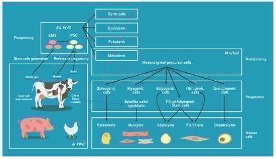 Firstly, by addressing the issue of division and differentiation as part of cellular self-renewal ability, scientists started employing pluripotent embryonic stem cells (ESCs) for their potential to differentiate into almost any cell type, while still keeping the ESC colony fully active []. ESCs are explanted to form a cell culture implantationally—delayed blastocysts, specifically from the inner cell mass []. Their infinite division is due to the unique identity of ESCs, a rich network of transcription and epigenetic factors that program their pluripotency [,]. However, ESCs’ pluripotency decreases in their offspring cells to a major extent through a process of forming more specialized multipotent stem cells []. Mesenchymal stem cells—MSCs—for instance keep their quiescence and the ability to potentially activate [,] and further divide. The latter gives hope that MSCs can be used for further replication, proliferation and full mature tissue formation in the process of CM [,]. In vitro culturing of pluripotent stem cells such as ESCs is established, but still represents a very “dirty” process in which the cell-specific differentiation is mediated by selected components of the cell media. Moreover, recent efforts to generate a stable culture of bovine embryonic stem cells delivered from blastocyst-stage embryos were successful [,].
