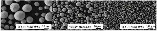TC4 specimens with different porosities are produced by the SLM process. The particle size of the used powder is 15~45 µm, which was measured by scanning electron microscope (SEM) as shown in Figure 1. The chemical composition of TC4 powder and workpiece is listed in Table 1. The porosity is controlled by adjusting the printing parameters, including scan velocity, laser power, and hatch spacing, as given in Table 2. The printing parameters are chosen based on the Refs. [22,23,24,25]. The stack of layers is along the Z-axis with the layer thickness of 30 μm and the scanning strategy of 45° rotation between layers.