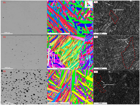 Optical microscopy (left), EBSD (middle), and band-contrast images (right) of the SLM Ti-6Al-4V materials studied. Top view: sample T1 of porosity 0.29%; middle view: sample T2 of porosity 0.88%; bottom view: sample T3 of porosity 5.41%.